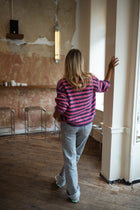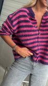Sweet and stylish, the Pink and Purple Striped Cybelle Cardigan features soft fabric, long sleeves, and a slightly loose fit for effortless comfort. Pink and mauve stripes are accented by gold heart-shaped buttons, adding a playful, charming detail to any outfit.