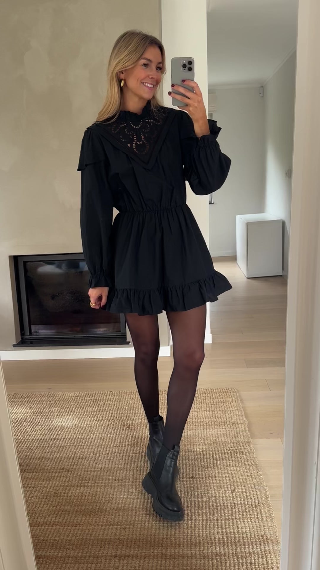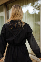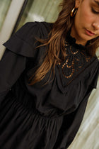 The Black Tilla Dress is a charming short cotton dress designed to balance structure with soft feminine details. Featuring a slightly high collar and long sleeves, it is finished with delicate ruffles at the cuffs and hem for added movement. The elastic waist defines the silhouette comfortably, while openwork embroidery on the bust and back adds a refined, romantic touch. Unlined for a light and airy feel, this dress is perfect for effortless day-to-evening styling.