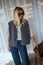 Stay cozy and stylish with the Gray Taoh Vest. Featuring a soft, shearling-effect texture, this sleeveless piece adds a touch of warmth and charm to any outfit. Its slightly cropped and loose fit creates a modern silhouette, complete with front pockets for a laid-back yet chic finish.