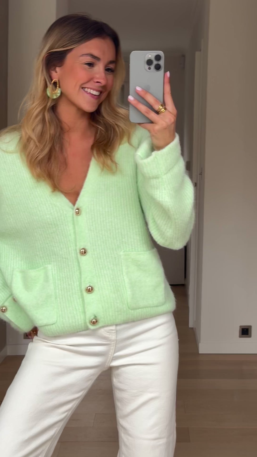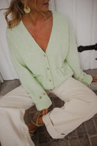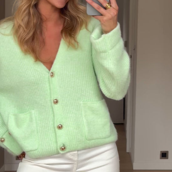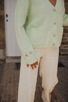 - Soft to the touch and rich in detail, this V-neck cardigan is finished with golden buttons on the bust and wrists. With two handy front pockets and a flattering cut, it’s the perfect piece to elevate your everyday layers.