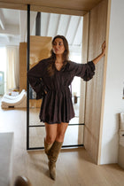 Feminine, flowy, and effortlessly stylish, the Brown and Black Laureline Dress is designed to move with you. Its flared sleeves and V-neckline add playful elegance, while the elastic waist creates a flattering, cinched silhouette. Crafted in doubled, flowing fabric, this short dress is perfect for making a statement at brunch, a night out, or any occasion where effortless chic is key.