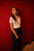 The Ecru Viana Blouse features short sleeves and a subtle smoky effect woven into the fabric, adding depth and texture to its clean ecru tone. Designed with a classic crew neck and a tight-fitting silhouette, it includes elastic for a comfortable, body-hugging finish.