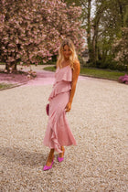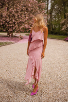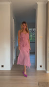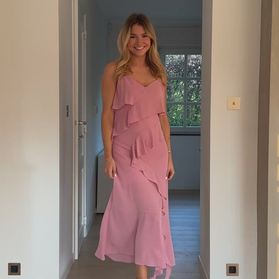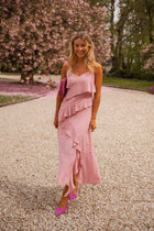 Graceful and effortlessly elegant, the Dusty Pink Romane Dress moves with you. This long dress features delicate ruffles that create soft movement, a flattering V-neckline, and adjustable straps for a perfect fit. Lined to mid-thigh for comfort and ease, it adds a subtle, refined charm to any look.