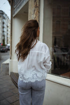 Delicate and stylish, the Ecru Ivan Lace Shirt features a shirt collar, button-up silhouette, and a lace hem for a feminine finish. Slightly cropped and loose-fitting, with a hint of transparency, it effortlessly balances elegance and casual ease—perfect for layering or wearing on its own.