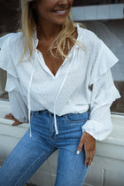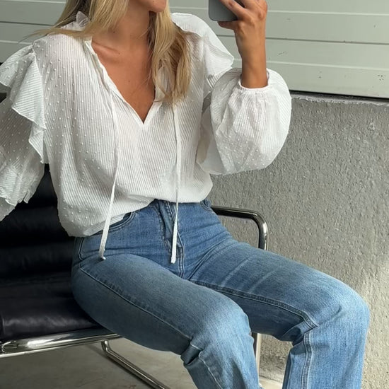 Light and chic, the Ecru Tiega Blouse is crafted from 100% cotton, swiss dot fabric. A v-neckline and ruffles adorning the sleeves and collar add a delicate touch completed with a tie at the neckline. Slightly transparent with long sleeves, it’s a versatile piece that works from day to night with ease.