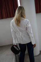 This White Evolene Shirt is designed with a traditional collar and button placket, featuring a back tie and a gently fitted shape that offers a chic and flattering fit.