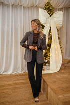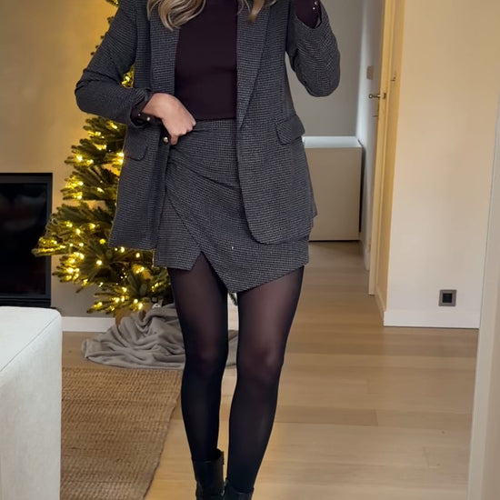 The Brown Checkered Eloa Jacket is a stylish blazer crafted in a tweed-effect fabric with a fully lined interior for comfort. Featuring side pockets and a tailored fit, it’s perfect for adding a polished, classic touch to any outfit.