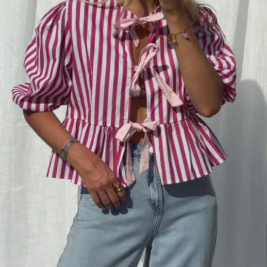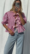 The Red Striped Gillie Blouse features soft half-length sleeves, a classic round neckline, and playful pink ties that add a fresh, feminine touch. An easy statement piece for any casual look.