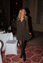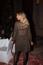 • The Black and Gold Ageda Dress blends sophistication with a hint of allure. Its golden lurex fabric catches the light as it drapes fluidly over your figure, while the long sleeves and front bow tie offer a chic and feminine touch. The slightly sheer back adds a dash of mystery, making this dress perfect for evening events or special occasions.