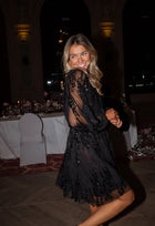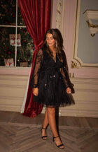 - Shine in the Black Camelia Dress, a stunning piece featuring glitter details for added glamour. The flattering V-neck and pleated effect create a graceful silhouette, while the fluid design and lined interior ensure comfort and movement. Perfect for both special occasions and nights out, this dress combines elegance and style effortlessly.