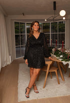 - Make a statement with the Black Henno Dress. Its shiny fabric and v-neckline create a sleek, sophisticated look, while the v-shaped open back and bow tie add a touch of chic. Featuring long sleeves, an elastic waist, and a lined design, this dress combines style and comfort for any occasion.