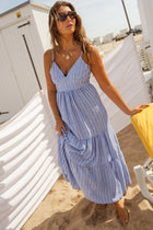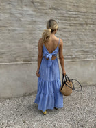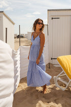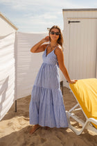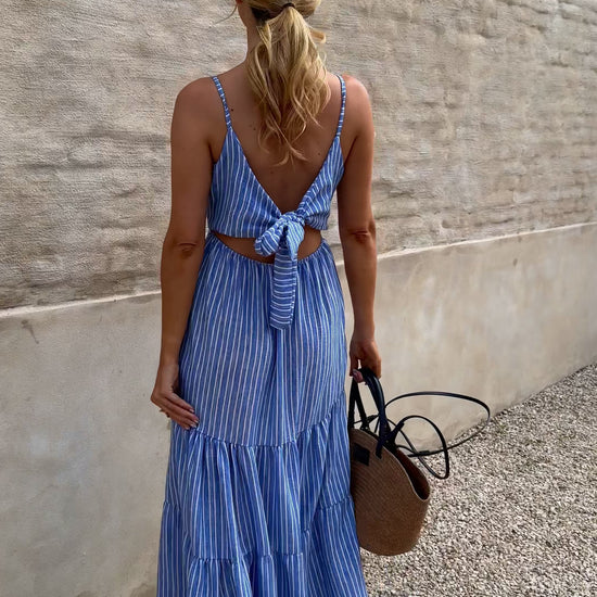 - The Blue and Ecru Striped Orria Dress is an effortless blend of charm and ease. With its flowing silhouette, delicate straps, and breezy striped fabric, it’s made for warm, carefree days. The open back with a tie-bow detail adds a soft, feminine twist to this fluid, unlined long dress.