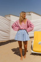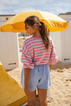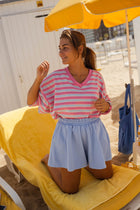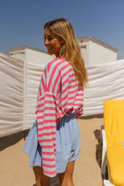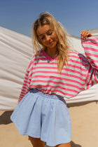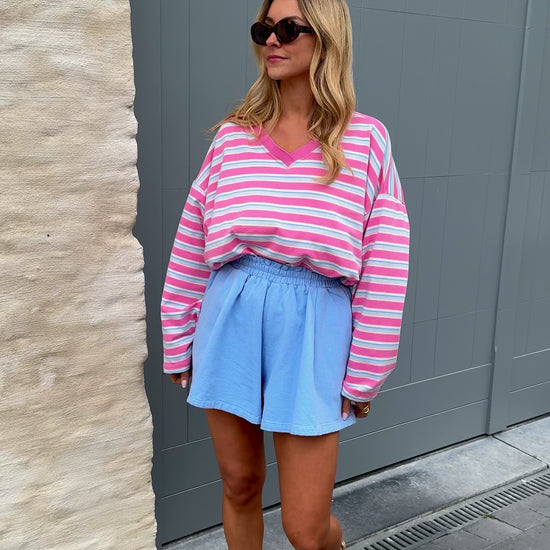 - Effortlessly stylish, the Pink and Blue Dorota T-shirt features a flattering V-neckline and long sleeves, with a pattern of pink, blue, and ecru stripes. It's a laid-back essential with just the right touch of color and charm.
