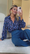 - Beautiful blue patterned shirt with long sleeves, adorned by a row of sleek black buttons running along its entirety, presents a slightly sheer and flowy design. This piece effortlessly combines modern elegance with a lightweight feel, making it a versatile and stylish addition to your wardrobe!