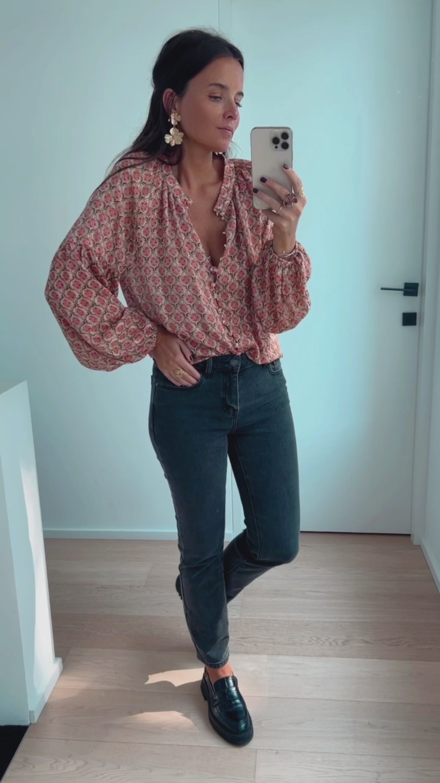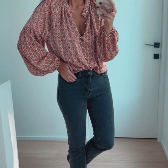 - Beautiful patterned long sleeve blouse with stunning balloon sleeves, as well as silvery Lurex in the fabric. This blouse has a flowy fit, elastic at the wrists and buttoning all up the front. The perfect blouse to dress up or down all season long!