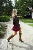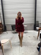 Romantic and refined, the Burgundy Indra Dress features a flowing silhouette with a ruffled hem and a slightly high collar. Its cinched waist flatters the figure, while the sheer back and teardrop opening add a delicate, alluring touch. Lined for comfort—except at the back—it’s the perfect balance of grace and sophistication.
