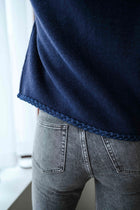 The Blue Isadora Cardigan combines classic charm with a modern twist. It features a round neckline, long sleeves, and silver buttons, elevated by braided trims on the collar, cuffs, and placket. Blue denim details add a touch of contrast, making it a chic and versatile layering piece.