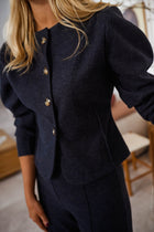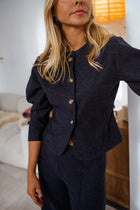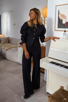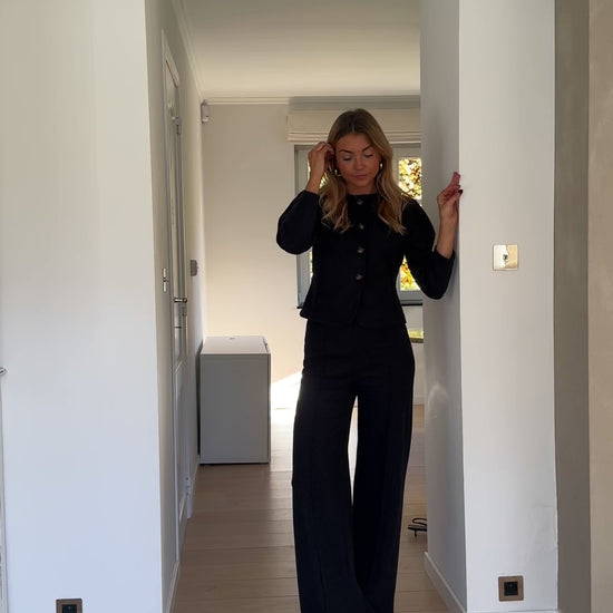 Designed for comfort without compromising style, the Dark Grey Henny Set is crafted from soft, comfortable fabric with a subtle heathered effect. The slightly cropped top features a button-up silhouette, 7/8 sleeves, and structured epaulettes. The matching trousers are finished with an elastic waistband and a slightly flared cut at the bottom, creating a relaxed yet polished silhouette perfect for everyday wear.