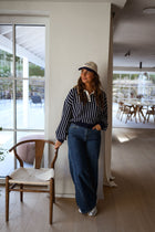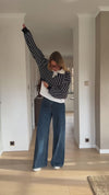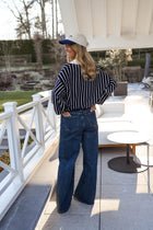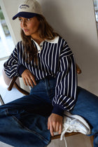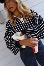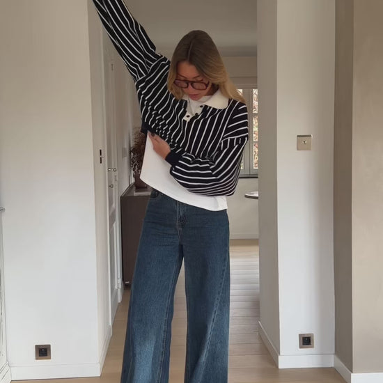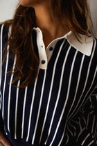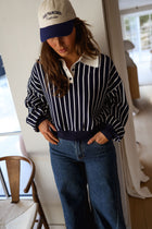 The Blue Striped Azriel Sweater is a modern classic with a stylish edge. Designed with long sleeves and a slightly cropped hem for a flattering silhouette, it features a sleek collar with a silver zipper pull tab that adds a contemporary, sporty touch. Soft, comfortable, and effortlessly versatile, this sweater is perfect for layering or making a statement on its own.