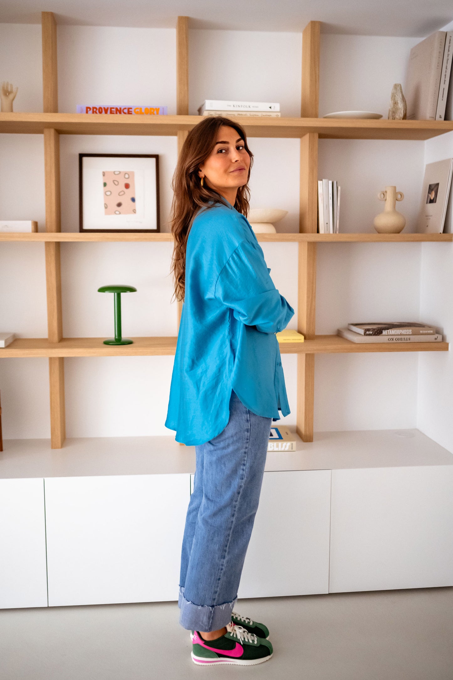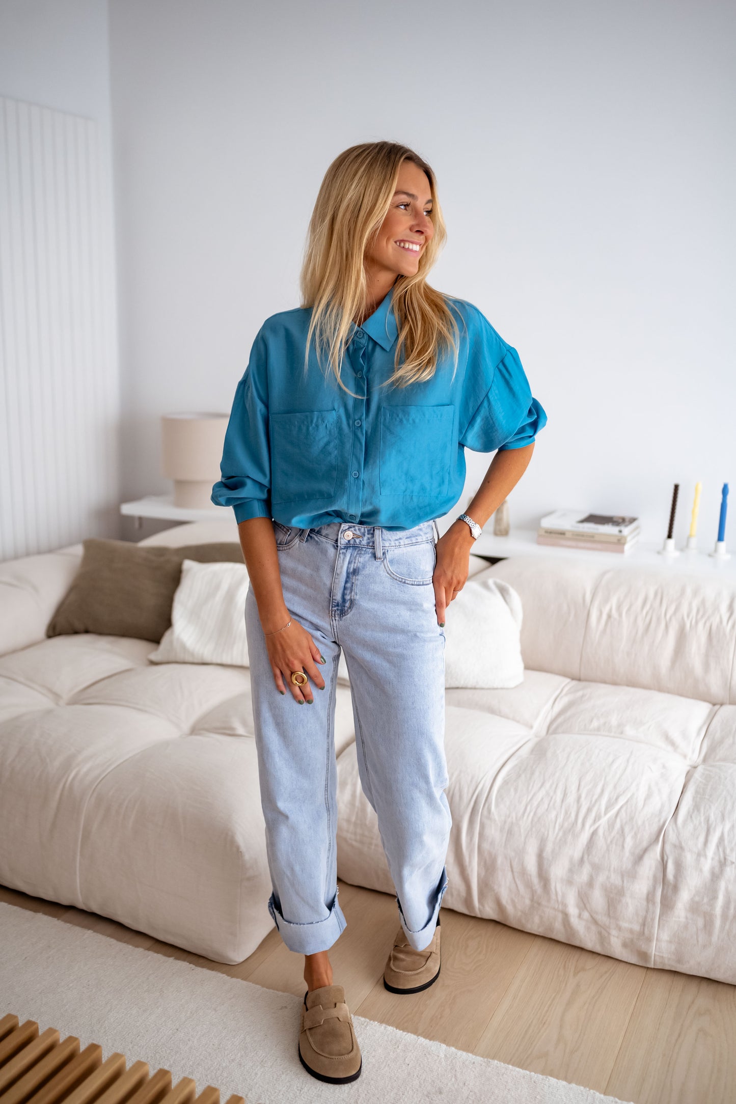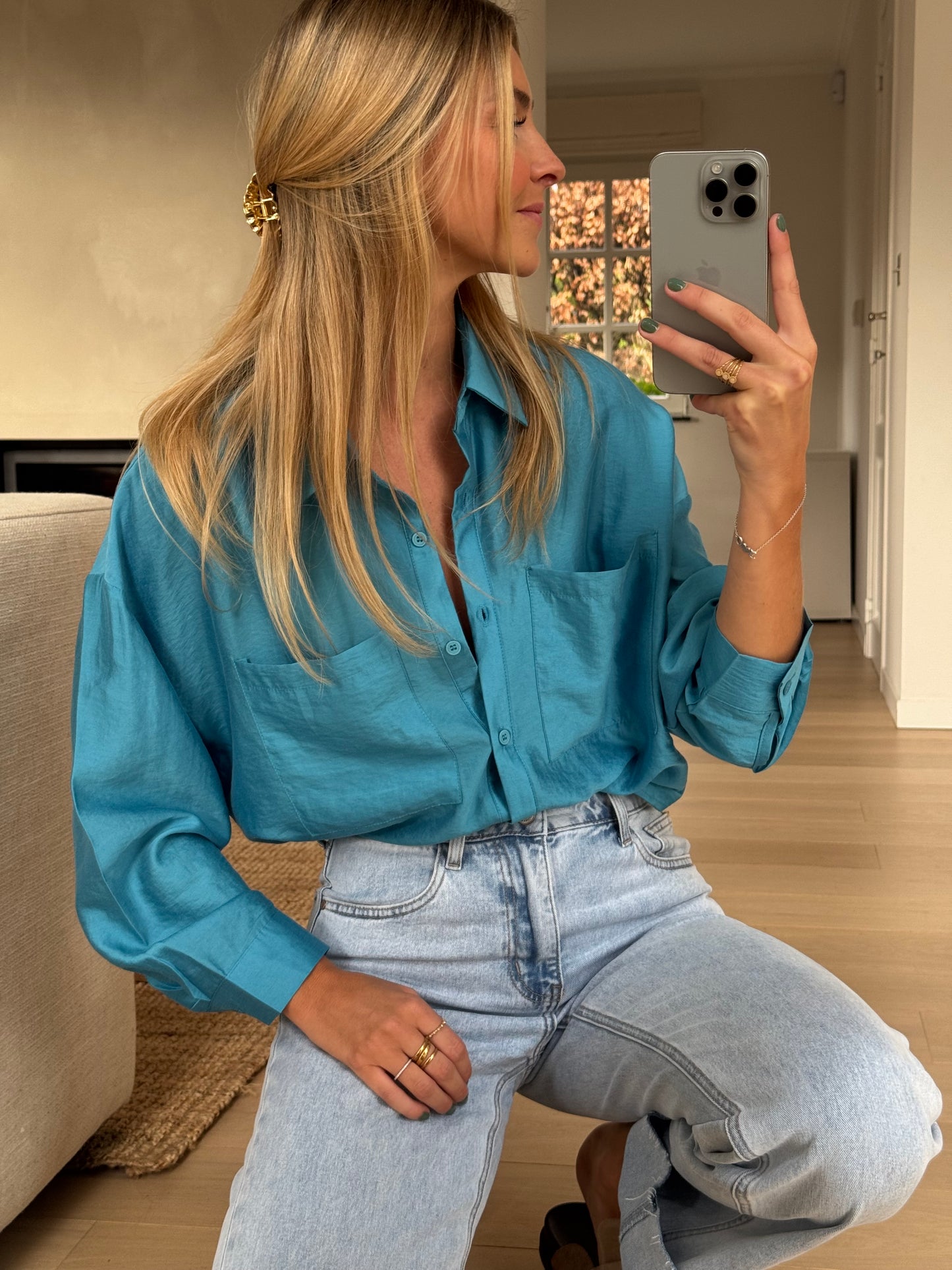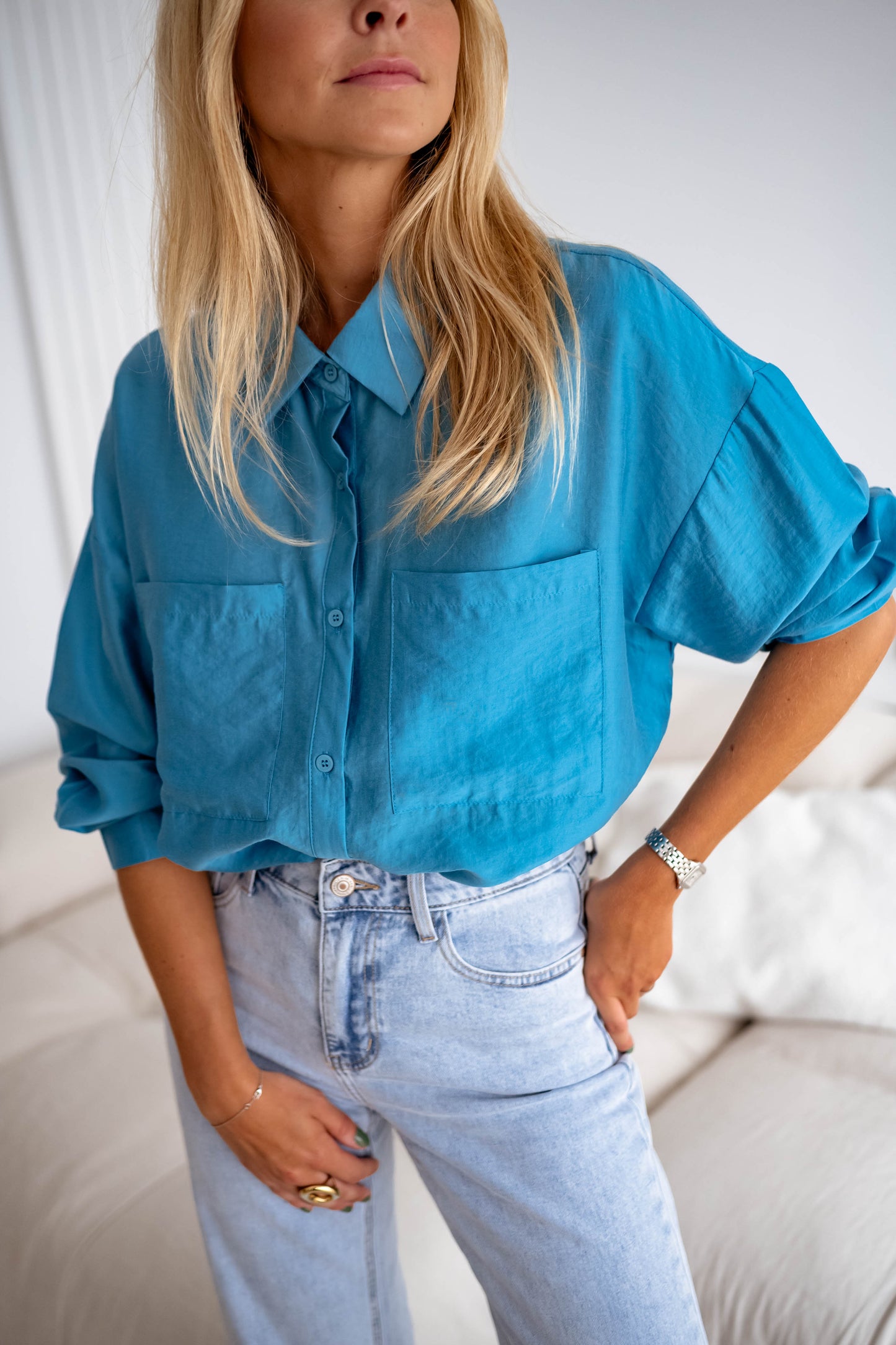 - Effortlessly refined, the Blue Taiba Shirt brings a touch of sophistication with its fluid drape and subtle satin effect. Designed with a classic shirt collar and detachable buttons, it offers both versatility and elegance. The two front pockets add a practical yet stylish detail, while the long sleeves enhance its timeless appeal. Whether dressed up or down, this shirt is a statement in understated luxury.