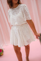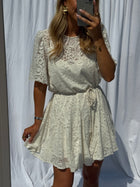Delicate and detailed, the Ecru Vassili Dress features soft lace, a round neckline, and a subtle ruffle hem. With a tie at the waist, a back button closure, and an included ecru underdress, it's both romantic and easy to wear.