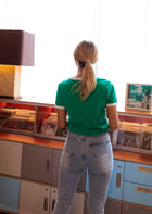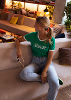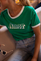 - This green Amor T-shirt with a crewneck and short sleeves is a stylish and comfortable addition to any wardrobe. The crewneck provides a classic and versatile look, while the short sleeves add breathability and comfort. Whether you're dressing up for a night out or keeping it casual for a day of errands, this T-shirt is a must-have for any fashion-forward individual.