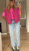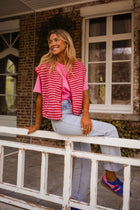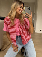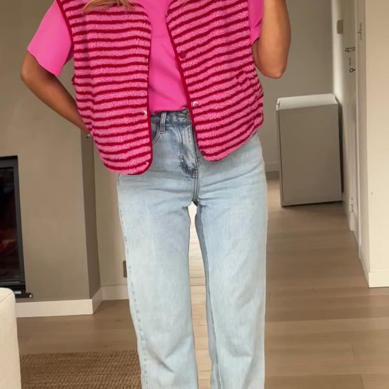 The Pink and Red Striped Taoh Vest blends comfort with bold style. Crafted from soft faux shearling, it features vivid stripes, a relaxed, cropped silhouette, and practical front pockets—perfect for layering on cooler days.