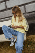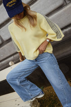 Warm and uplifting, the Yellow Larry Sweater brings a cheerful twist to a relaxed essential. Its slightly loose fit and 3/4 sleeves create an easy, laid-back silhouette, while the red stripes along the sleeves add a playful contrast. Finished with a classic crew neck and crafted in Italy, the Yellow Larry Sweater is a feel-good piece that brightens everyday styling.