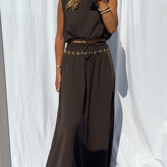 The Chocolate Alyssa Skirt is crafted from soft cotton gauze with a fluid drape and a comfortable elastic waist. Made in Italy, this long skirt is unlined yet non-transparent—perfect for effortless, everyday style.