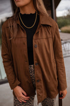 - Wrap yourself in timeless charm with the Chocolate Nore Suede Jacket. Crafted with a luxurious suede effect, smooth lining, and side pockets, it combines style and practicality. The matching belt cinches the waist for a flattering silhouette, making it a perfect statement piece for any outfit.