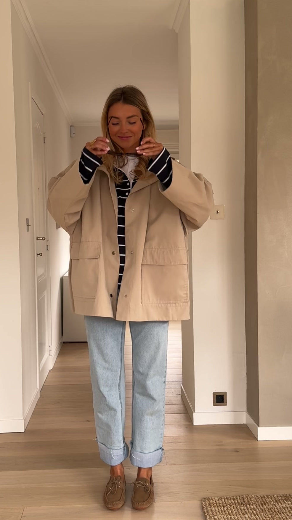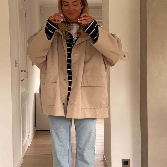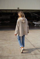 - The Beige Bradley Jacket combines functionality and style. With long sleeves, a silvery zipper, and a hood for added comfort, this jacket is perfect for laid-back days. Featuring snap buttons on the sides and pockets for convenience, it offers a slightly loose fit and an easy-going vibe.