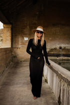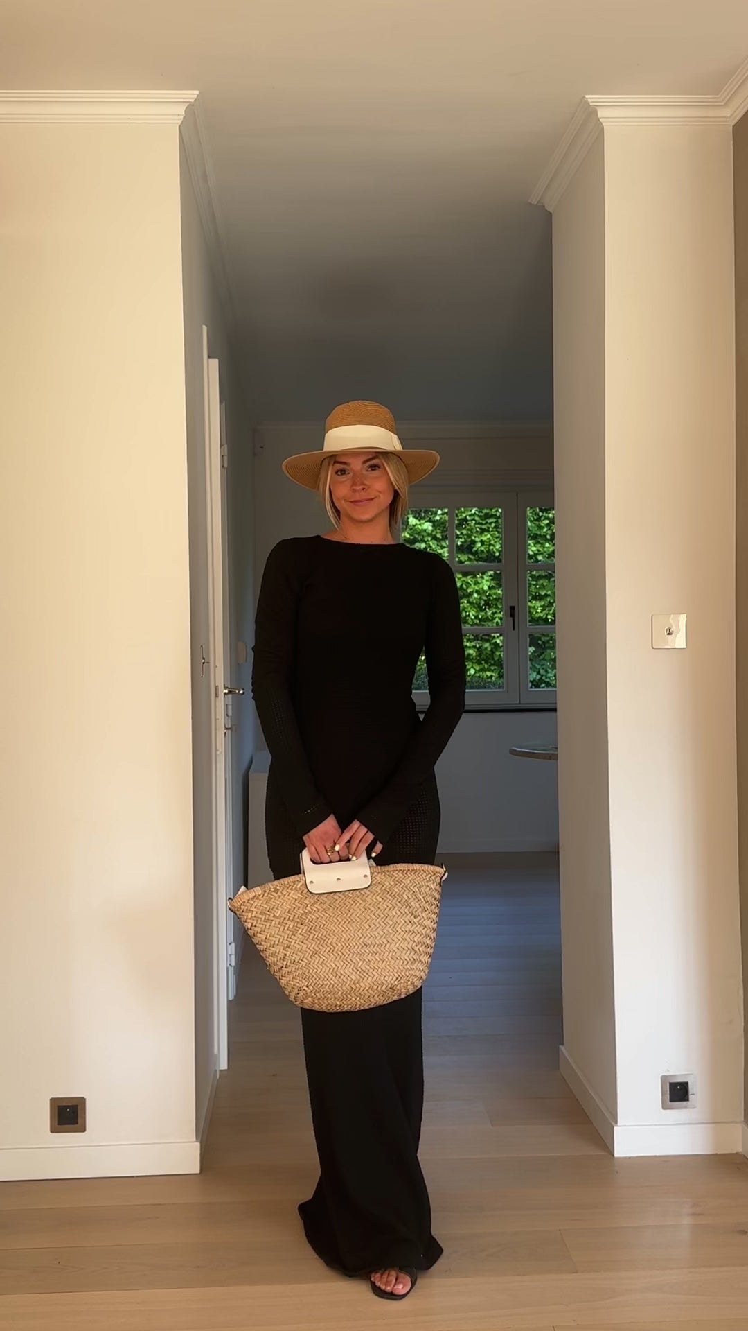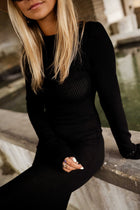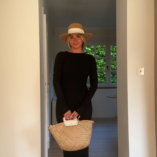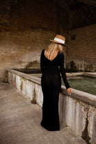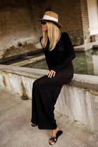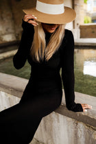 Made for warm days and golden hours, the Black Mela Dress blends versatility with bold style. Its long, fitted silhouette is crafted from semi-sheer crochet-effect fabric—perfect for layering over swimwear. Long sleeves add balance to the look, while the reversible design lets you choose between a u-neckline in the front or back. Whether worn poolside or out at sunset, it’s a statement in effortless confidence.