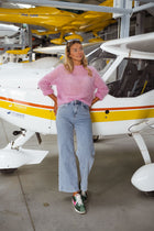 - Our model is also wearing the Yellow Sely Top, the White Eternal T-Shirt, the Blue Striped Nicoli Polo Shirt, and the Pink Valda Sweater