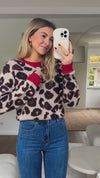 - Chic, long sleeve sweater that features leopard print patterns all over as well as red detailing around the neck/collar, wrists and bottom hem. This sweater has a crewneck and is super soft and cozy!