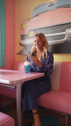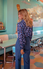 - Beautiful blue patterned shirt with long sleeves, adorned by a row of sleek black buttons running along its entirety, presents a slightly sheer and flowy design. This piece effortlessly combines modern elegance with a lightweight feel, making it a versatile and stylish addition to your wardrobe!