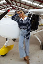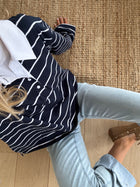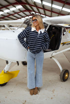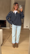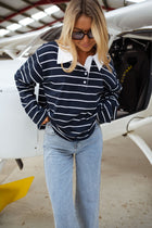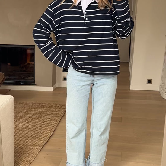 - The Blue Striped Nicoli Polo combines classic style with a relaxed fit. Featuring long sleeves, a crisp white lapel collar with button detailing, and a loose, comfortable silhouette, it’s the perfect piece for a smart-casual look.