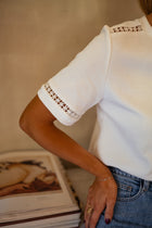- White crewneck t-shirt that is curated from a thick-cotton fabric that features dainty embroidery detailing on the collar and sleeves making this the perfect spring-summer tee!