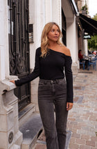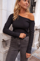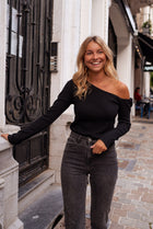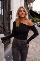 - Stunning thin-knit, black sweater with long sleeves and a soft, luxurious texture embodies both comfort and style. This asymmetrical design adds a contemporary flair to your wardrobe, making it a versatile and chic choice for various occasions!