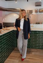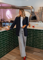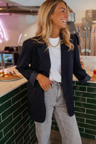 • Experience ultimate comfort and style with this luxurious, loose-fitting blue Norma blazer. Featuring long sleeves, front pockets, and a flattering length, it's the perfect addition to any wardrobe. The added lining adds a touch of luxury that will elevate your look.