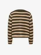 • Khaki and beige striped long sleeve cardigan that is super soft and cozy, as well as having beautiful golden hardware-detachable button detailing up the front. This cardigan is perfect for those cozy Fall and Winter days and nights!
