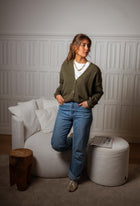 • Experience ultimate comfort and effortless style with our Khaki Gina Cardigan. Featuring a flattering V-neck, long sleeves, and a soft buttoning tab, this cardigan is the perfect addition to your wardrobe.