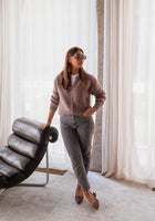 • Experience the allure of the Taupe Calista Cardigan with its stylish crewneck, sleek silver zipper, and slightly cropped design.