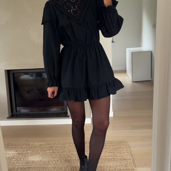 The Black Tilla Dress is a charming short cotton dress designed to balance structure with soft feminine details. Featuring a slightly high collar and long sleeves, it is finished with delicate ruffles at the cuffs and hem for added movement. The elastic waist defines the silhouette comfortably, while openwork embroidery on the bust and back adds a refined, romantic touch. Unlined for a light and airy feel, this dress is perfect for effortless day-to-evening styling.