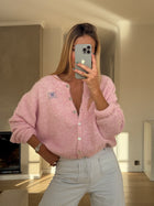- Satisfy your fashion cravings with the Pink Harris cardigan! Featuring a charming "Self Love Club - Easy Clothes" label, this soft and slightly loose cardigan boasts long sleeves and pearly buttons running along its length. Elevate your wardrobe with this must-have piece.