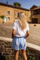 - Our model is also wearing the Blue Erica Shorts