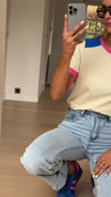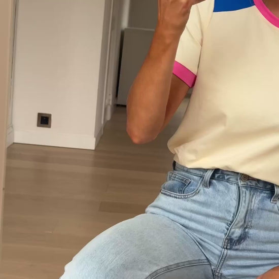 Playful and easygoing, the Pink and Blue Nicki T-Shirt adds a pop of color to your casual wardrobe. Featuring a pink “friday - yeah!” graphic, this short-sleeved tee stands out with its pink crewneck, matching sleeve edges, and contrasting blue accents on the shoulders.