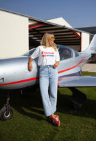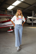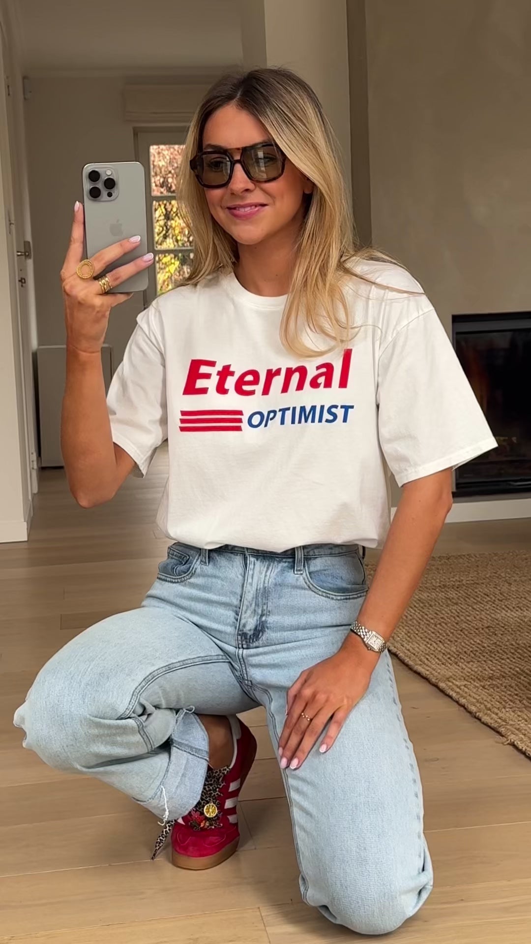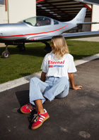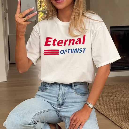- Crafted for comfort and style, the White Eternal T-shirt features a classic crewneck and short sleeves. The bold red and blue “Eternal Optimist” logo adds a vibrant touch to this slightly loose-fitting tee, making it the perfect addition to any casual outfit.