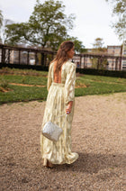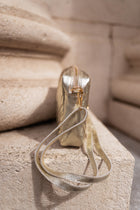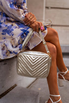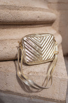 • Glistening golden, leather handbag that features a rectangular shape, golden finish, and a strap included to wear and style the bag in numerous ways.