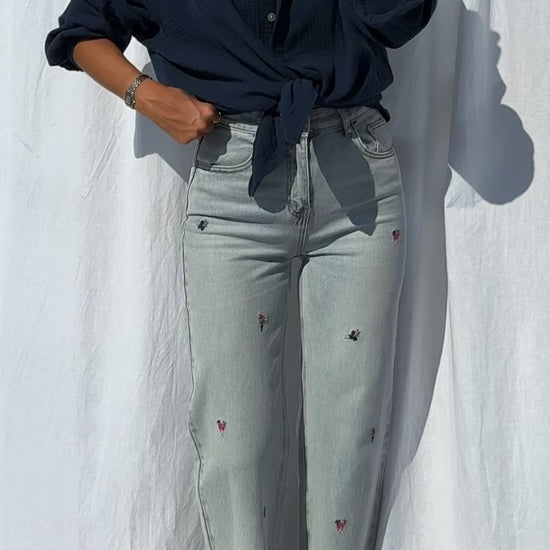 Elevate your denim with the Blue Floral Anabella Jeans—high-waisted, slightly cropped, and detailed with a vibrant floral embroidery on the front. Designed with belt loops and front pockets for both style and function