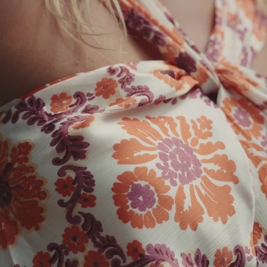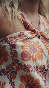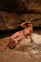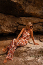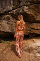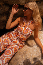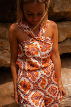 - The patterned Orange Roxane Jumpsuit features chest straps that are tied at the bust, paired with an elastic back for added flexibility. The jumpsuit is also flowy and fully lined, with side pockets for convenience.